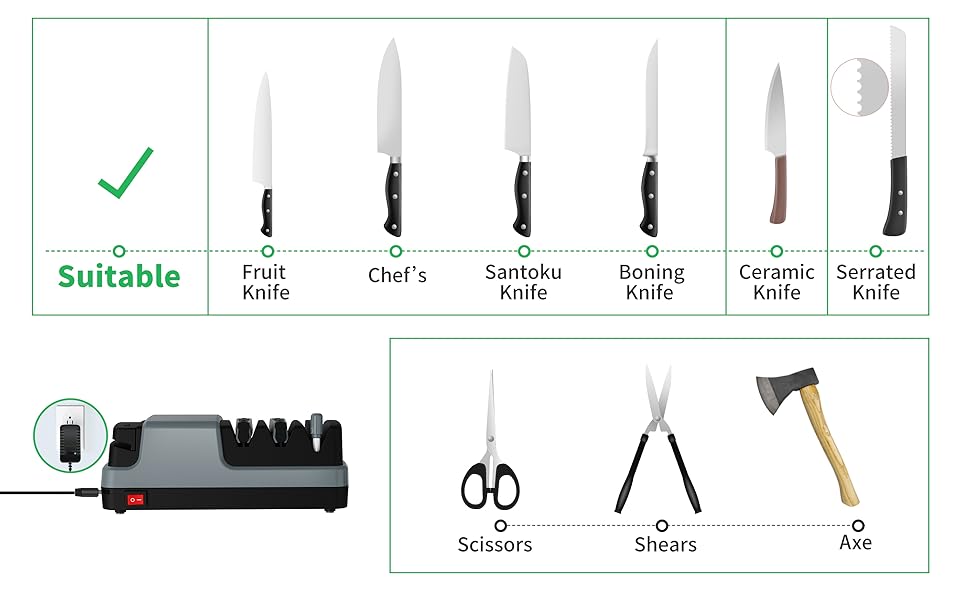 Premium Performance: Engineered for durability and efficiency, the Electric Knife Sharpener delivers long-lasting, ultra-sharp blades with minimal effort. Perfect for home chefs, outdoor enthusiasts, or anyone who values precision.