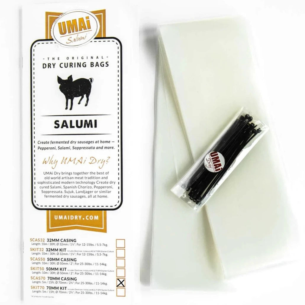 Includes: 15 ft. (5m) UMAi Dry 70mm (2.25 in) diameter sausage casing and zip ties for a quick and secure closure.