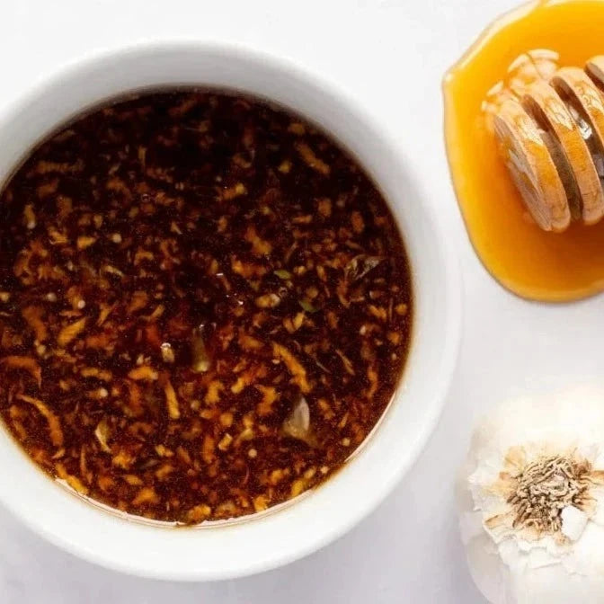 Ingredients: Honey Powder (soy, wheat), Brown Sugar, Salt, Dextrose, Spice, Spice Extracts, Sodium Phosphates, Roasted Garlic, Citric Acid, Caramel Powder.