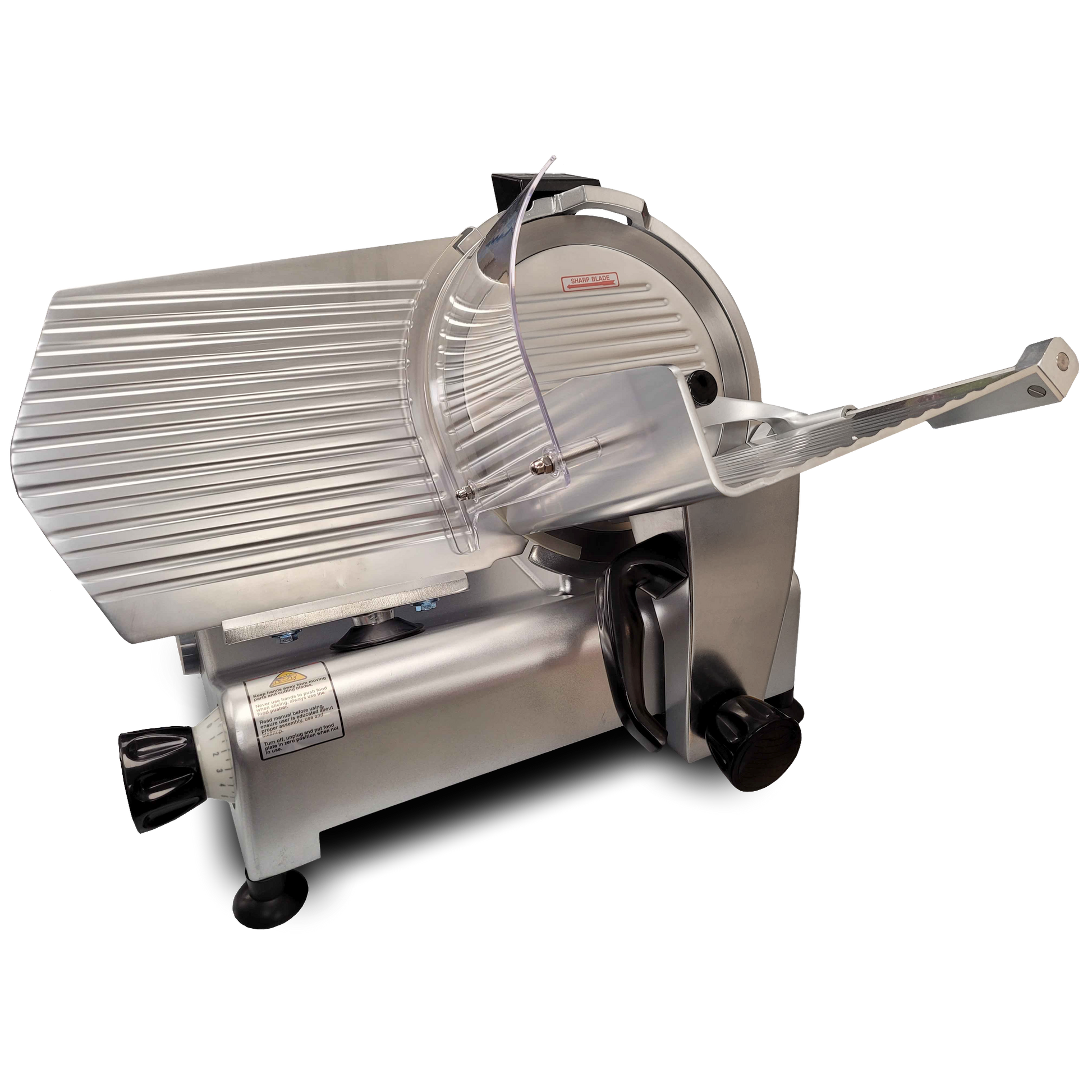 This professional-quality, deli-style slicer delivers the performance and power of a commercial-grade model. It has a 12" blade to tackle large cuts of cured and cooked meat, as well as cheeses and breads. Also works great on slightly frozen beef or wild game to make jerky prep a breeze. A cut resistant glove should be worn when removing, cleaning, or handling the slicer blade.