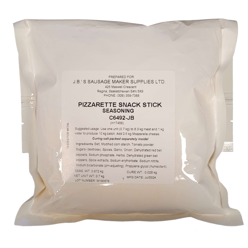 Bring the classic taste of pizza to your next batch of snacksticks with our Pizzarette Sausage Pre-Mix with Cure. This unique blend delivers a bold, savory flavor with notes of tomato, garlic, herbs, and bell pepper—perfectly complemented by the addition of mozzarella cheese for a rich, melty finish. Ideal for anyone looking to add a fun, crowd-pleasing twist to their lineup of smoked or cooked snacksticks.